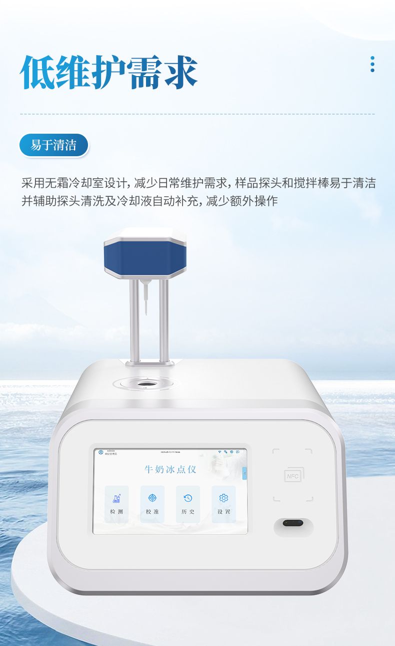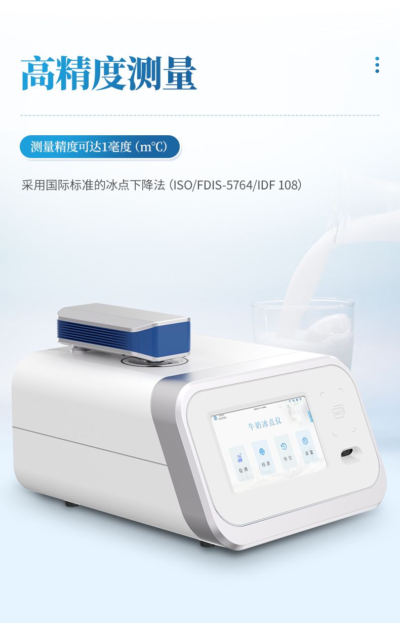 牛奶冰點儀是一種專門用于檢測牛奶純度的儀器,它通過測量牛奶樣品的冰點來判斷牛奶中是否摻水。這種儀器對于奶制品行業來說是非常重要的,因為它可以幫助確保產品質量和消費者的健康。本產品專為精準監測生鮮乳品冰點而設計,依托先進的熱敏電阻技術,可全程高精度檢測溫度變化,精準提取牛奶冷卻結晶的臨界點,以科學方法揭示樣品中潛在的水分摻雜情況。冰點的細微變化,是衡量牛奶純度與品質的直觀標尺,對于乳品加工行業、質量監控實驗室及科研單位而言,本產品是確保乳品品質、提升檢測效率的得力工具。