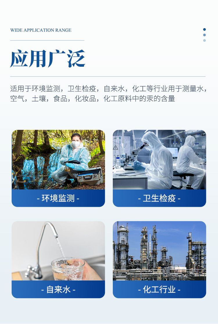 本儀器用于測量水,空氣,土壤,食品,化妝品,化工原料,中的汞的含量。同樣適用于衛生防疫,環境監測,化工,自來水等行業。