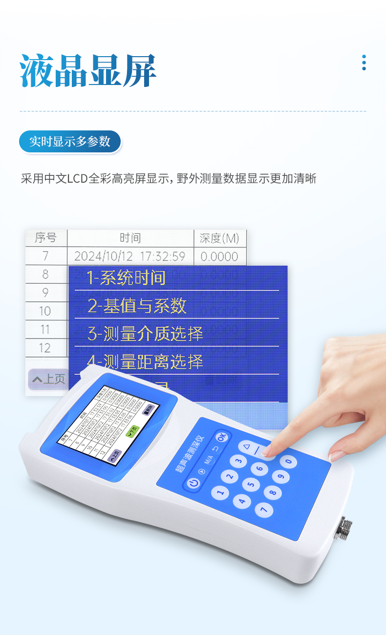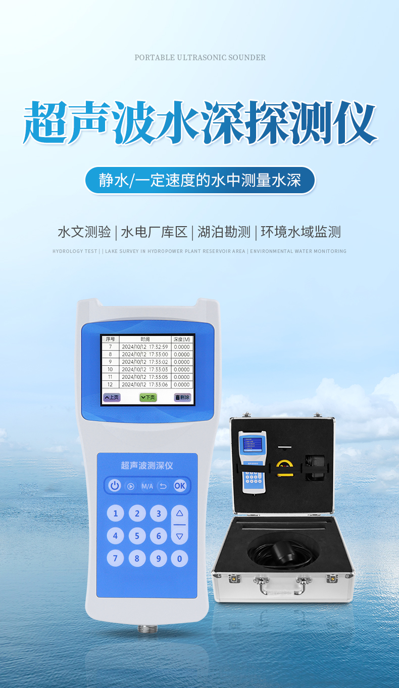 超聲波測深儀是測量水庫、湖泊、江河、淺海等水體的便攜式測深儀,測深時將超聲波換能器置于水面或一定位置,利用超聲波在水中的固定聲速VC和超聲波發射到接收的時間T,儀器自動換算出水深H。本品是我司積多年生產經驗,吸取了多種同類產品優點,而開發的一款方便適用的手持式超聲波測距儀表。超聲波收發轉換電路采用專用大規模集成電路,元件貼片率99%,并以液晶顯示測深結果,保證了產品的長期可靠性,同時將其功耗降到了極低。具有測量精確、耗電省、可靠性高、使用方便、操作簡單、測量速度準確、攜帶方便等優點。儀器可在靜水中測深,也可在具有一定速度的水中測深;水流速度可達5m/秒左右,是水文測驗、水電廠庫區、湖泊、河道勘測和環境水域監測的理想水深測量儀器。
