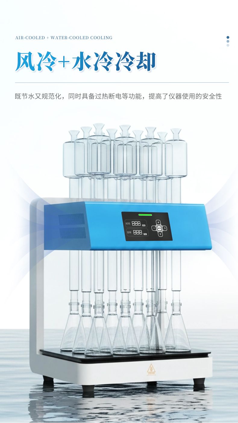 3. 安全性能優(yōu):采用玻璃毛刺回流管代替球形回流管,并以風(fēng)冷+水冷技術(shù)取代傳統(tǒng)自來水冷卻方式,既可以節(jié)水又能使儀器規(guī)范化,同時具備過熱斷電等功能,提高了儀器使用的安全性。 4.面板易清潔:采用石墨烯加熱板,表面光滑、平整,表面污漬一擦即凈,可減少操作不當(dāng)對儀器的損壞;