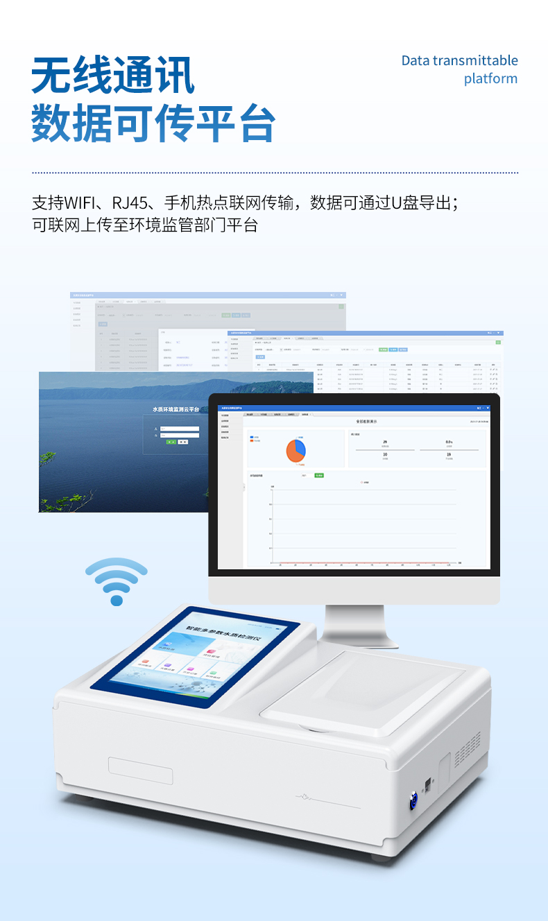 云平臺:儀器帶有監管平臺,連接有線/無線網絡,檢測結果直接傳輸至環境安全監管平臺;