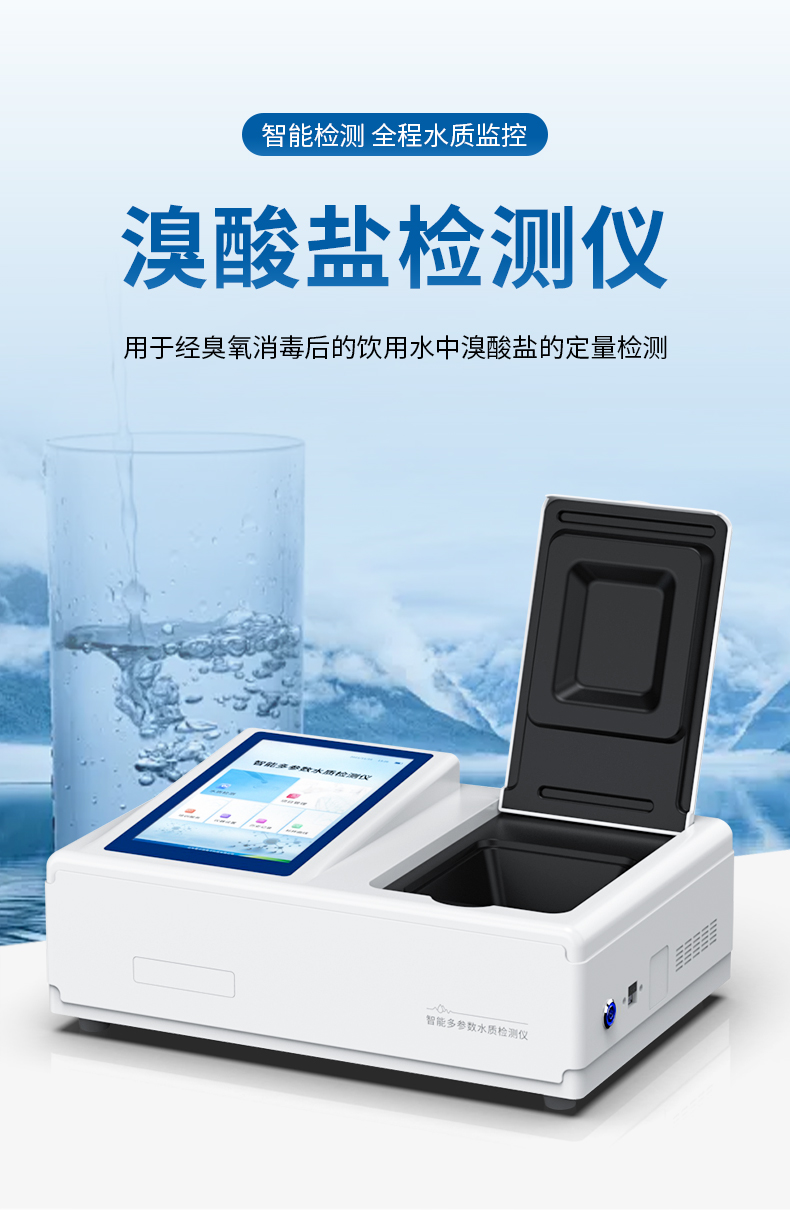 水質溴酸鹽快速檢測儀是一款檢測快速檢測水體中溴酸鹽含量的儀器,適用于經臭氧消毒后的礦泉水、凈化水、純凈水和各種包裝飲用水中溴酸鹽的定量檢測。
