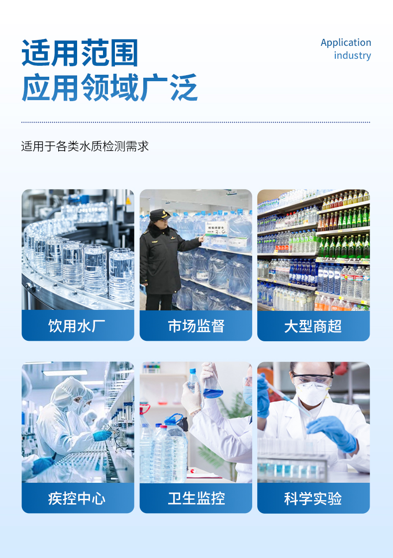 能夠廣泛的應用于飲用水廠生產檢驗、市場監督部門質量監督、大型商超質量抽檢、疾病控制中心、衛生監控等。