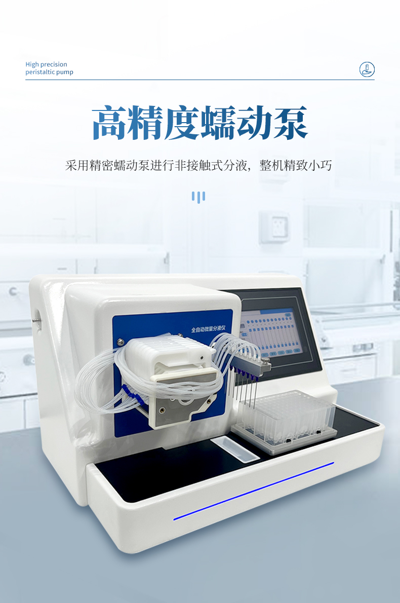 1、全自動微量分液儀采用精密蠕動泵進行非接觸式分液,整機精致小巧;
