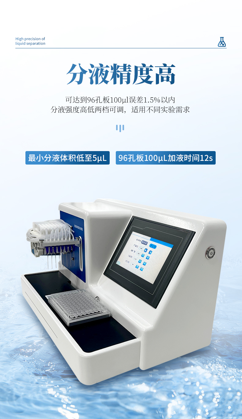2、分液精度高,可達到96孔板100μl誤差1.5%以內(nèi),最小分液體積低至5μL,96孔板100μL加液時間12s。