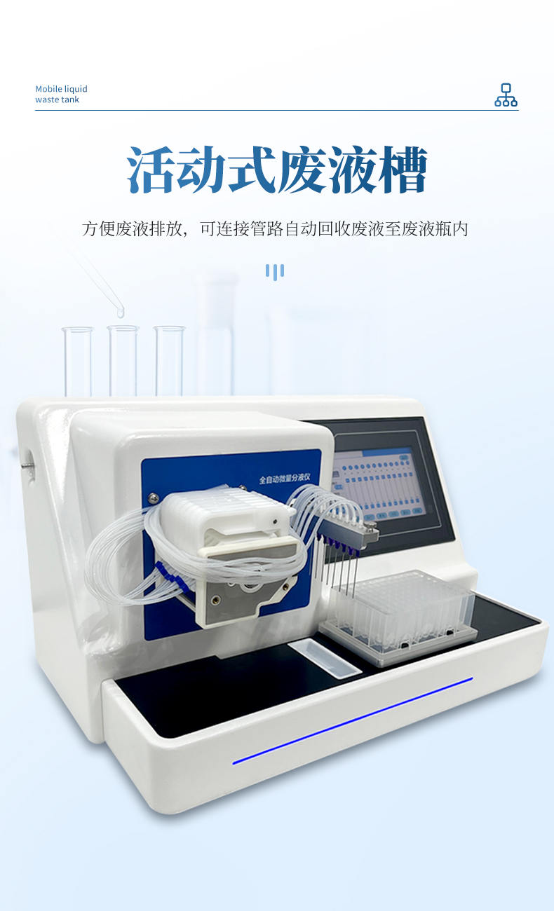 5、活動式廢液槽,方便廢液排放,可連接管路自動回收廢液至廢液瓶內(nèi)。