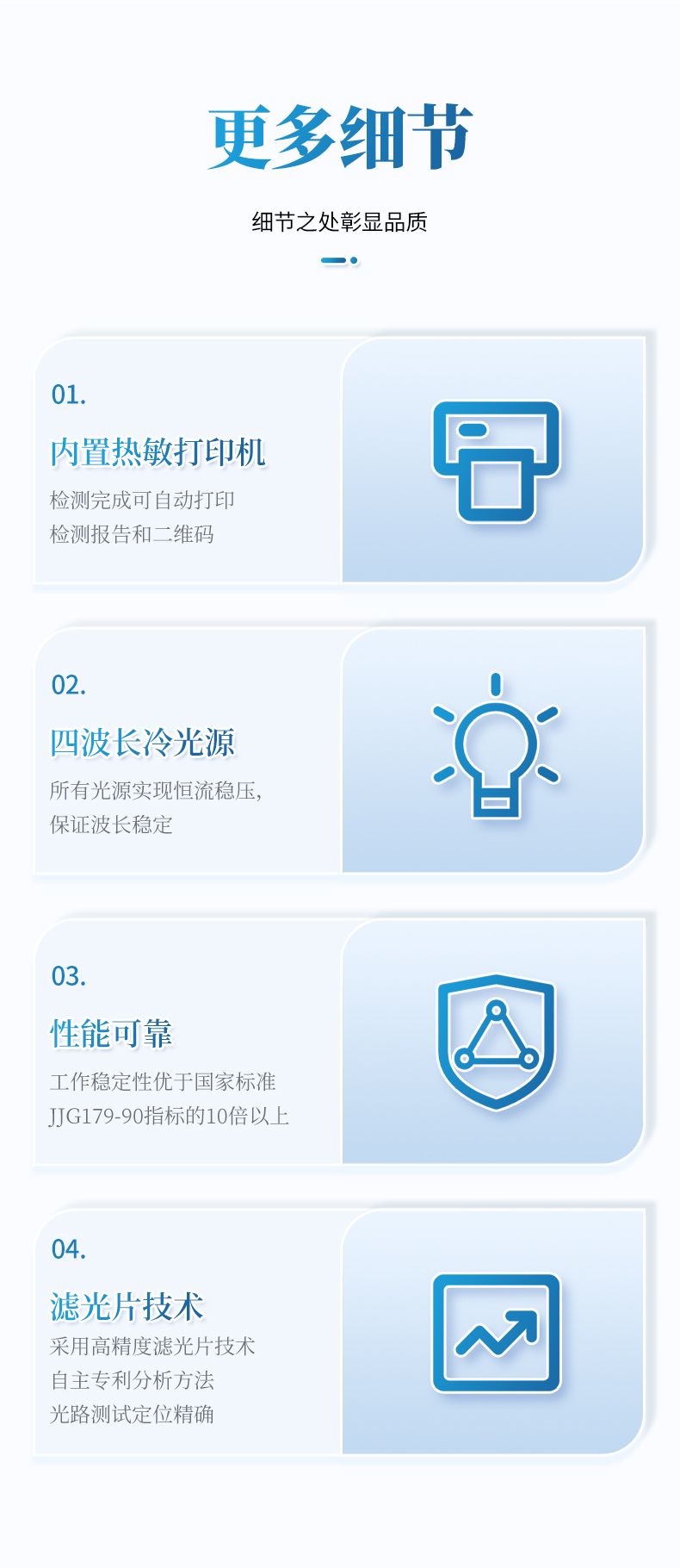 8、每個通道均配置四波長冷光源,所有光源實現恒流穩壓,保證波長穩定。 硅半導體作為信號接收系統,壽命長達10萬小時級別。重現性好,準確度高。