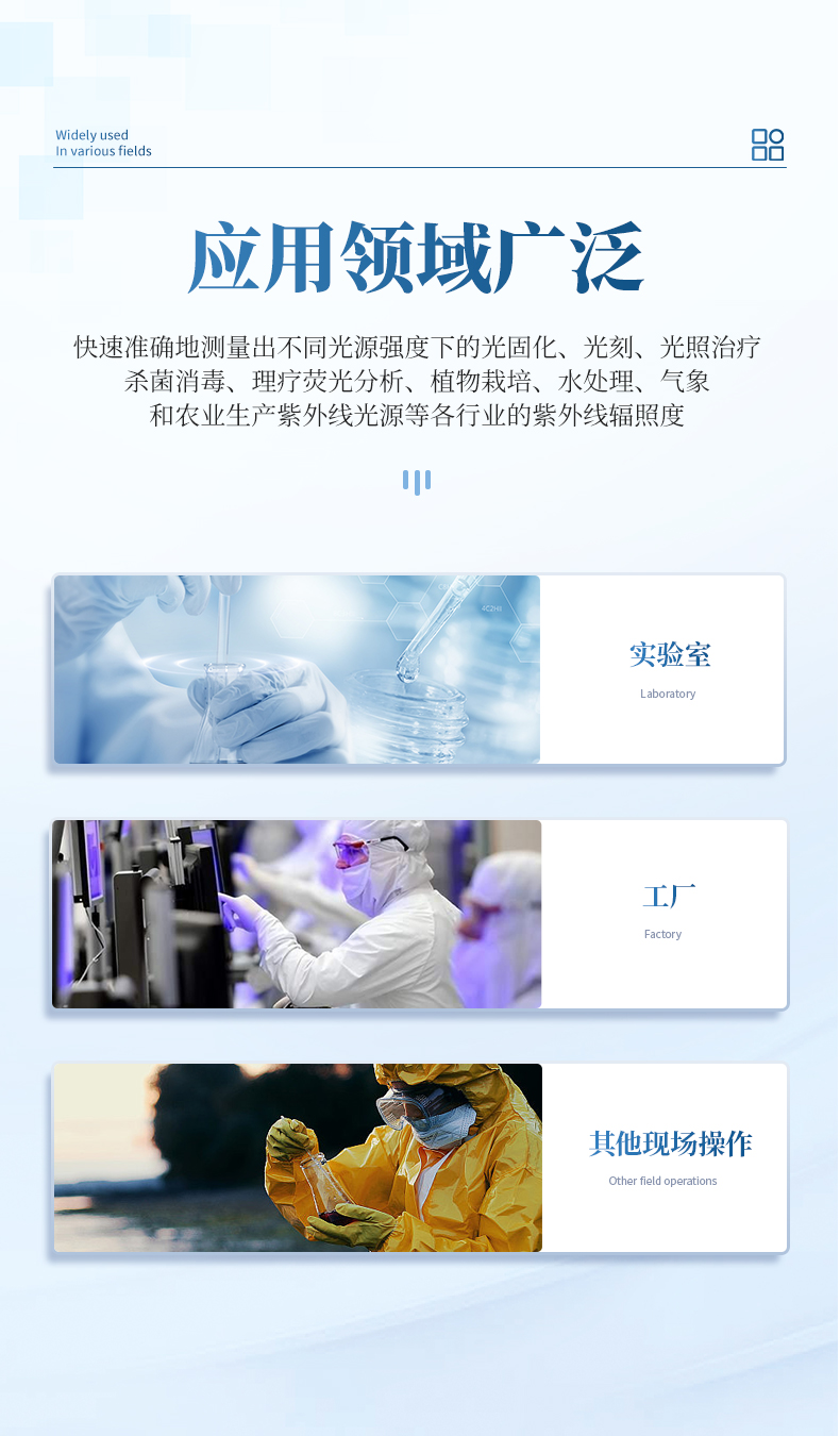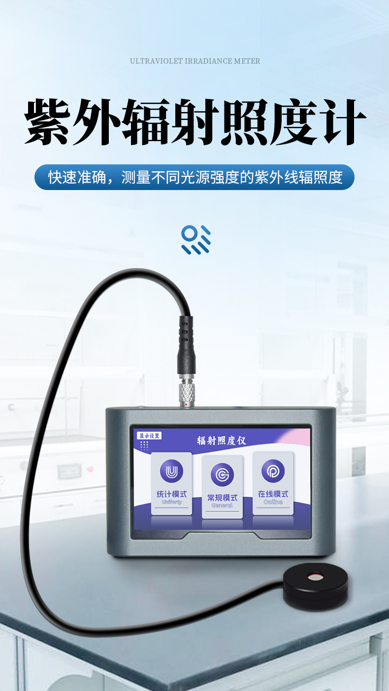 讀取,精度更高;測量模式可切換,可實時監控;可通過測試面光源不同區域、評價其均勻度;量程可自動識別切換,真正實現從弱光到強光一機式測試,儀器操作更加簡單快捷。快速、準確地測量出不同光源強度下的光固化、光刻、光照治療、殺菌消毒、理療熒光分析、植物栽培、水處理、氣象和農業生產紫外線光源等各行業的紫外線輻照度。