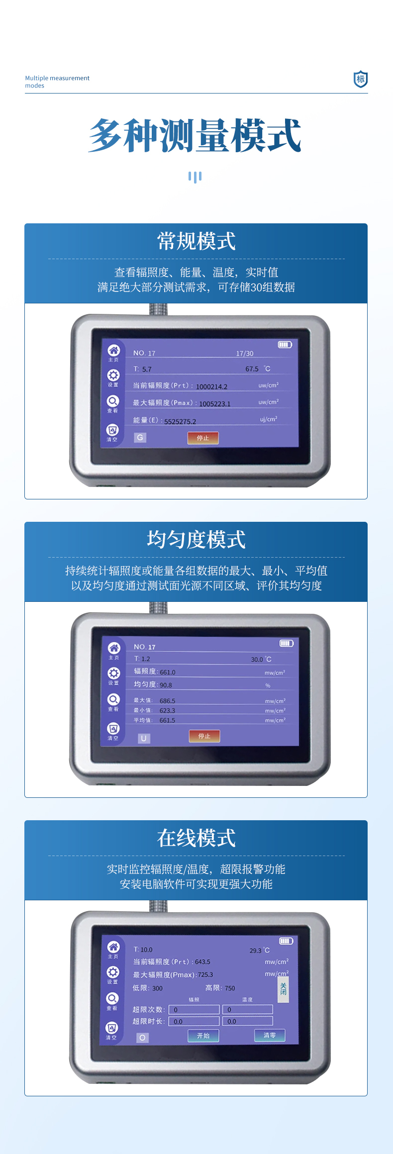 | 模式選擇: | 均勻度模式、常規模式、在線模式 |