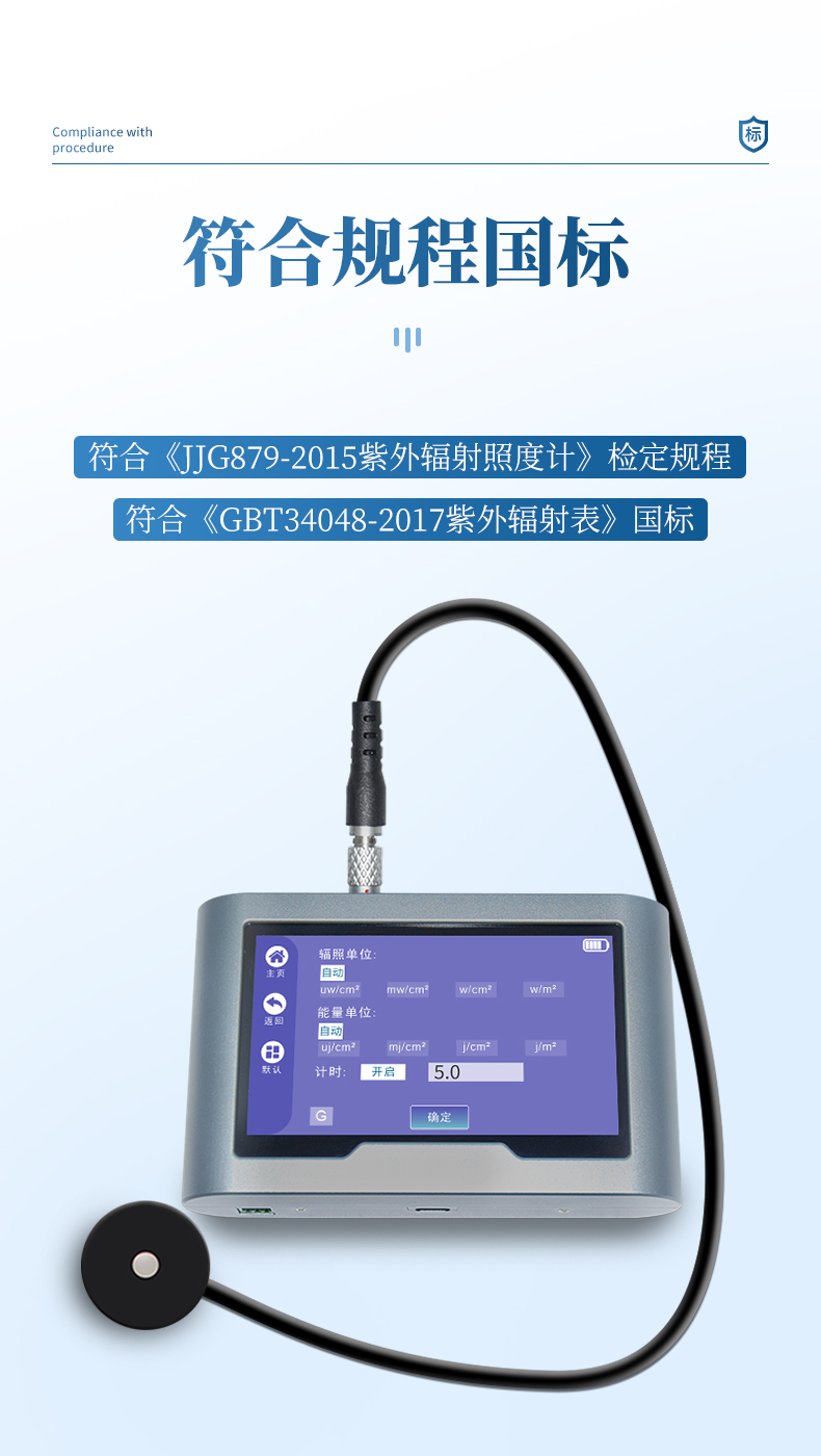 8.符合規程:《JJG879-2015紫外輻射照度計》檢定規程、《GBT34048-2017紫外輻射表》國標;