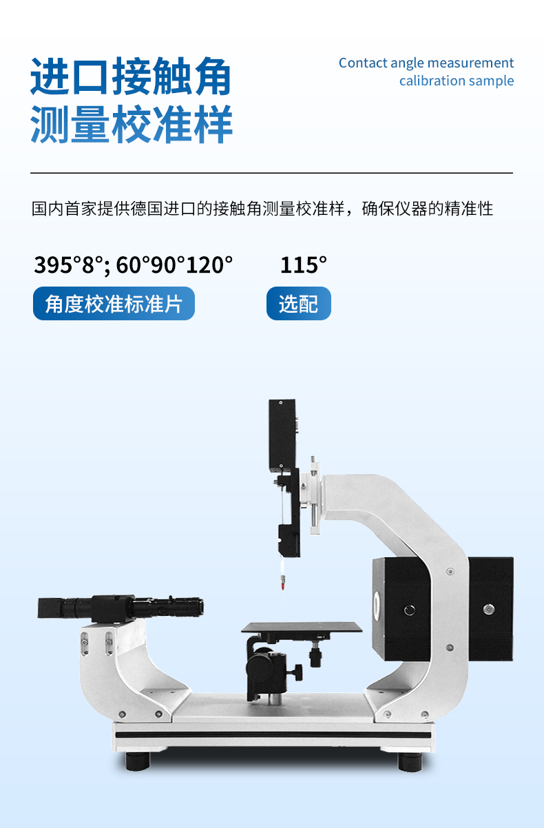 5. 國內首家提供德國進口的接觸角測量校準樣,確保儀器的精準性,角度校準標準片3°5°8° ;60°90°120°;115°(選配);