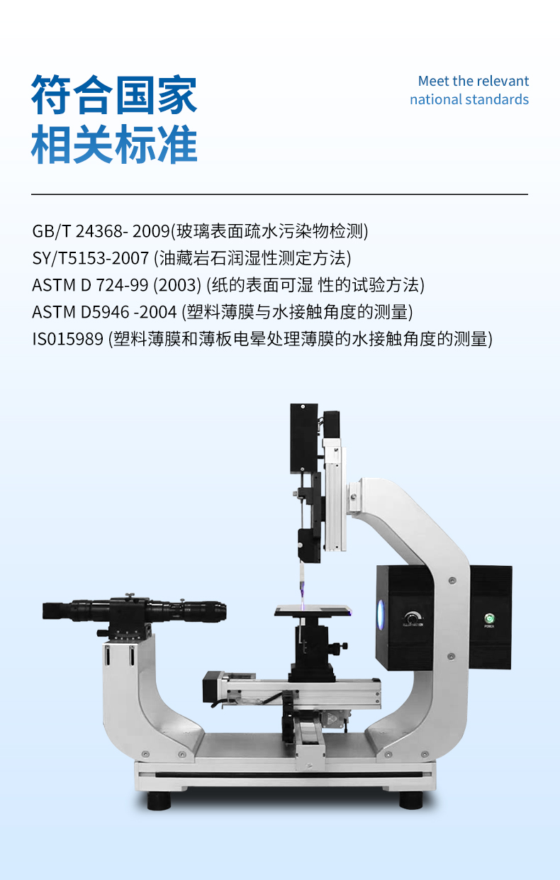 | 分析方法 | 國內最先進的接觸角測量分析軟件自動擬合法(一鍵自動擬合, 不存在人工誤差)包括:圓法擬合(Circle method)、橢圓/斜 橢圓擬合法(Ellipse/Oblique ellipse)、Young-laplace擬合、微分橢圓法/微分圓法(Differential circle / Differential ellipse); |