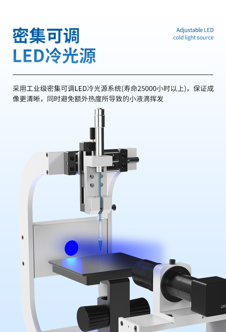 2. 采用工業級密集可調LED冷光源系統(壽命25000H以上),保證成像更清晰,同時避免額外熱度所導致的小液滴揮發;