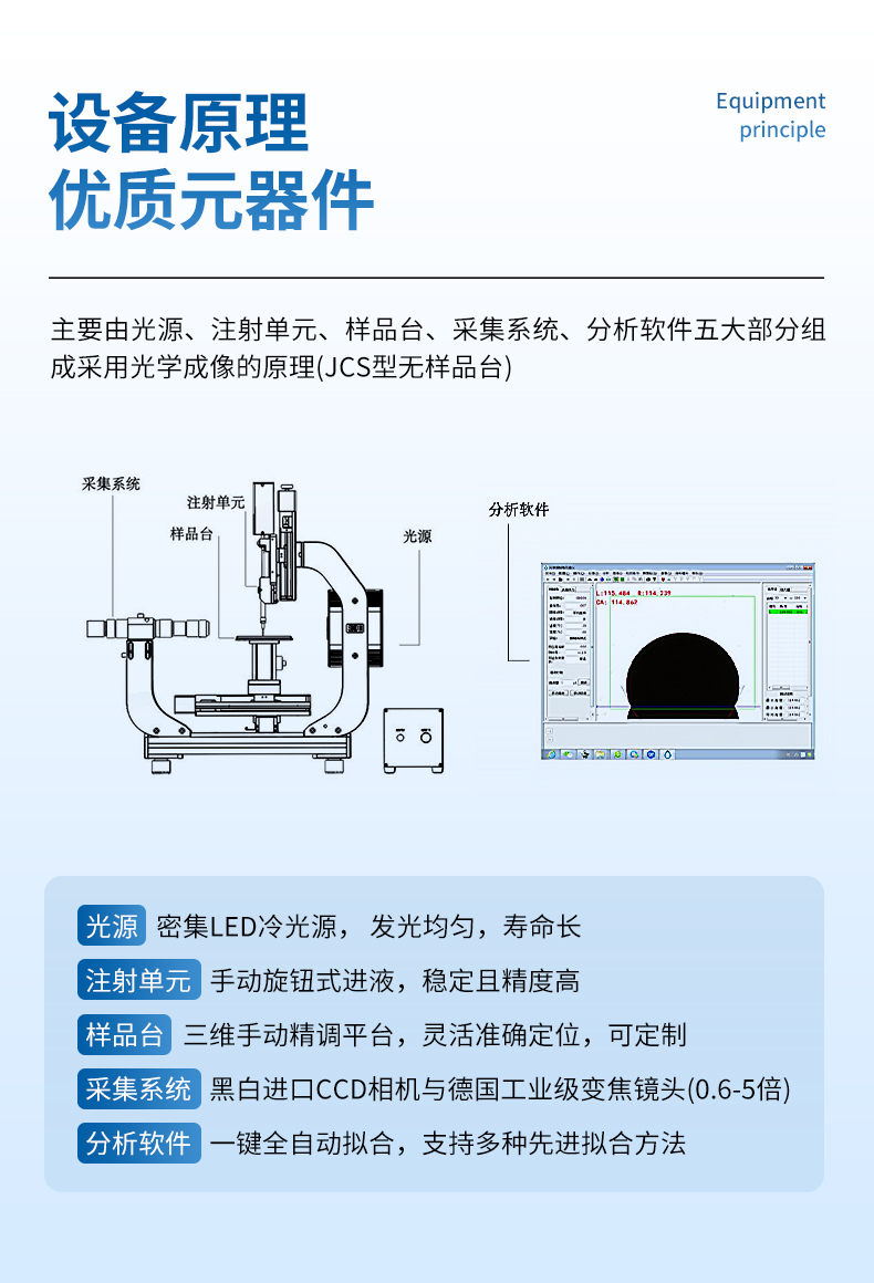 如上圖、接觸角測量儀主要由光源、注射單元、樣品臺、采集系統、分析軟件五大部分組成,設備采用光學成像的原理。