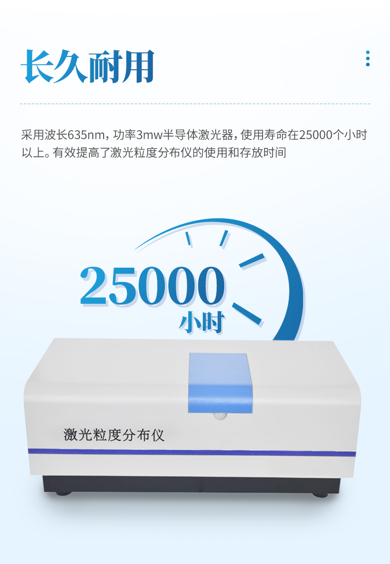 采用波長635nm,功率3mw半導(dǎo)體激光器,使用壽命在25000個(gè)小時(shí)以上有效提高了激光粒度分布儀的使用和存放時(shí)間。