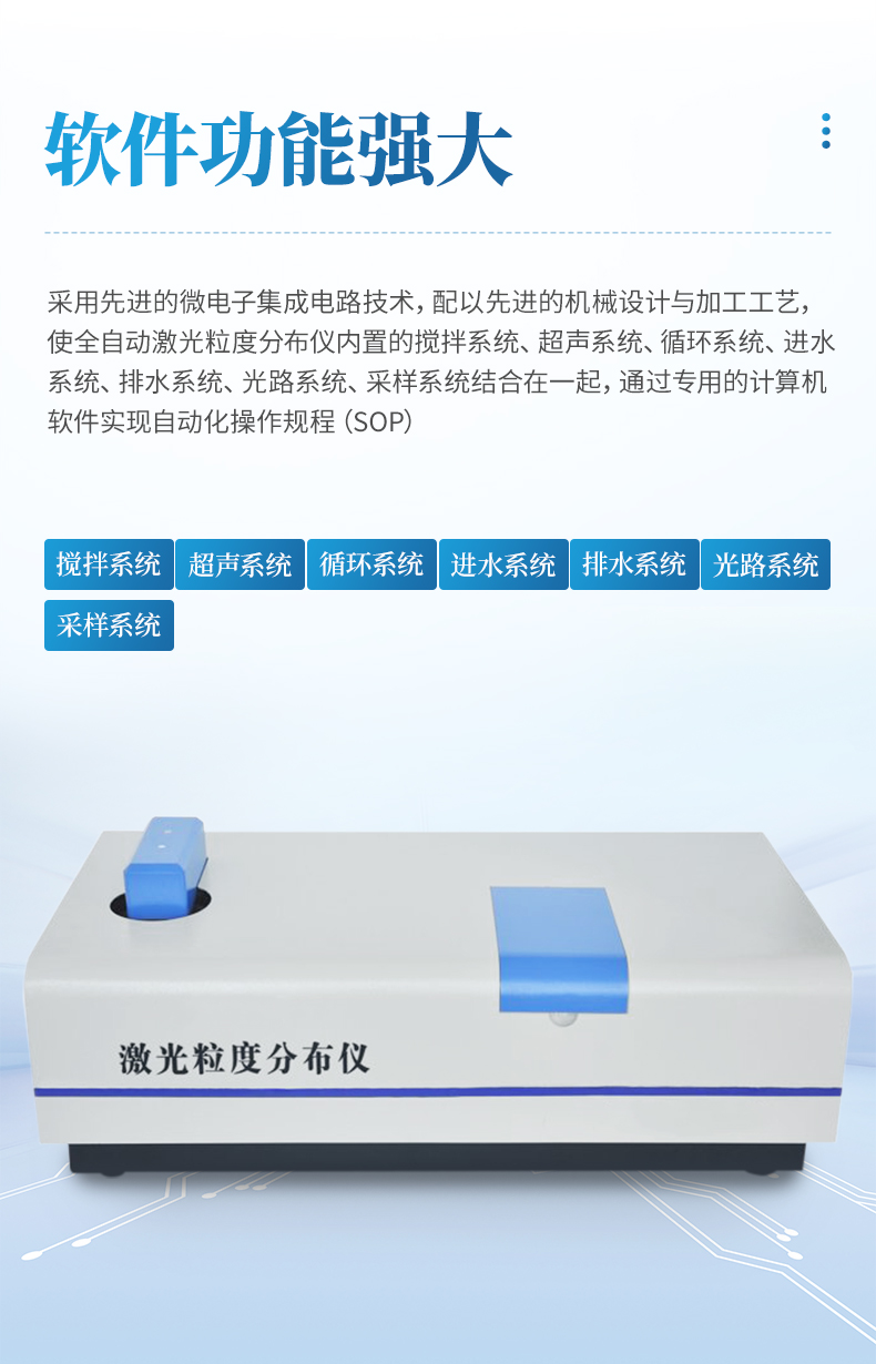 激光粒度分布儀系統(tǒng)是集光、機(jī)、電、計(jì)算機(jī)為一體的高科技產(chǎn)品,數(shù)據(jù)處理有專用的計(jì)算機(jī)分析系統(tǒng)軟件完成,同時(shí)由打印機(jī)完成測試報(bào)告的輸出。