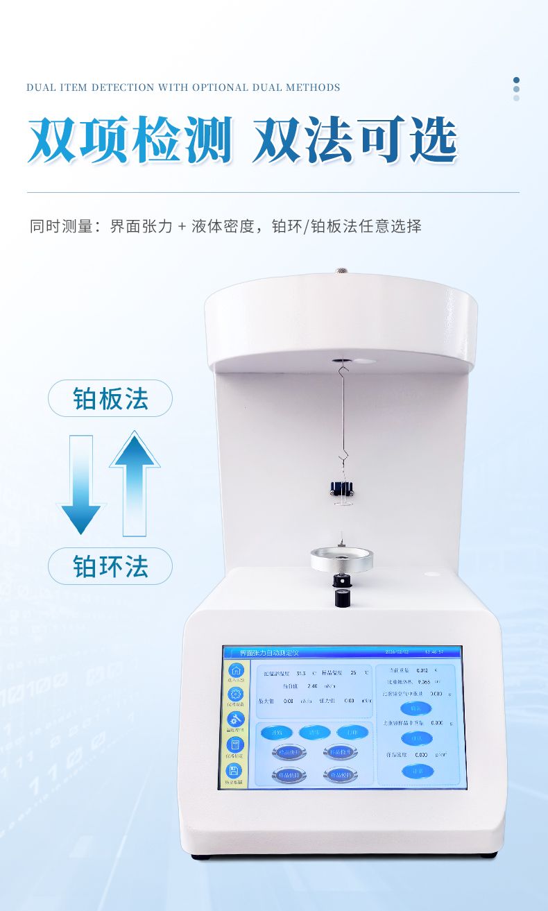 3. 可同時測表界面張力和密度:集成兩項測量功能,無需額外設(shè)備。