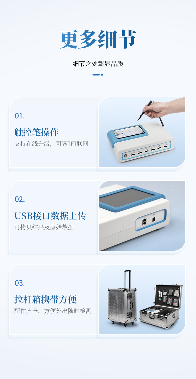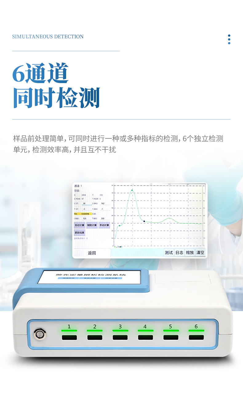 5、6通道設(shè)計(jì),可同時進(jìn)行一種或多種指標(biāo)的檢測,6個獨(dú)立檢測單元,檢測效率高,并且互不干擾;