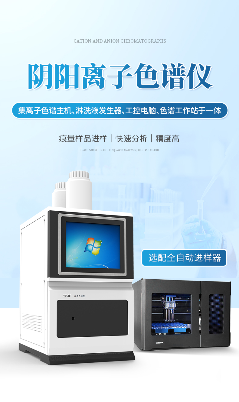 YP-IC+離子色譜分析儀核心零部件自主研發、自主知識產權可控。采用一體化設計,集離子色譜主機、淋洗液發生器、工控電腦、色譜工作站于一體,結構緊湊,流路最短,對流路造成的峰型擴展有很好的改善。一體化恒溫箱:色譜柱、抑制器、電導池、放大電路都處于同一恒溫系統,改善了電導檢測器的溫飄和基線噪聲。內置多處漏液報警器和缺水報警器,多方位安全監控。由PLC控制的各個部件統一到電腦顯示屏的集中軟件控制系統,操作方便,鼠標所見即所控。