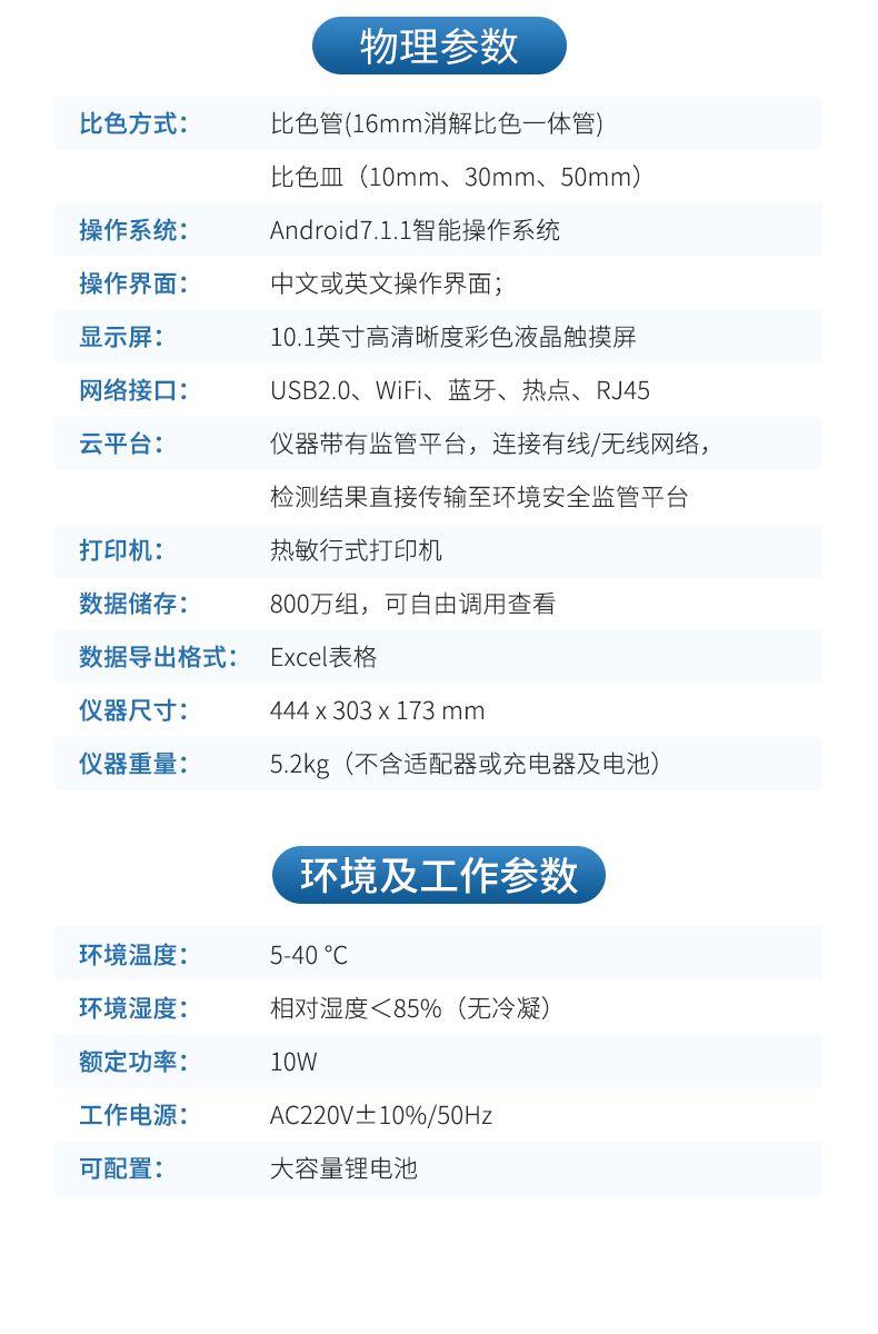 云平臺:儀器帶有監管平臺,連接有線/無線網絡,檢測結果直接傳輸至環境安全監管平臺;