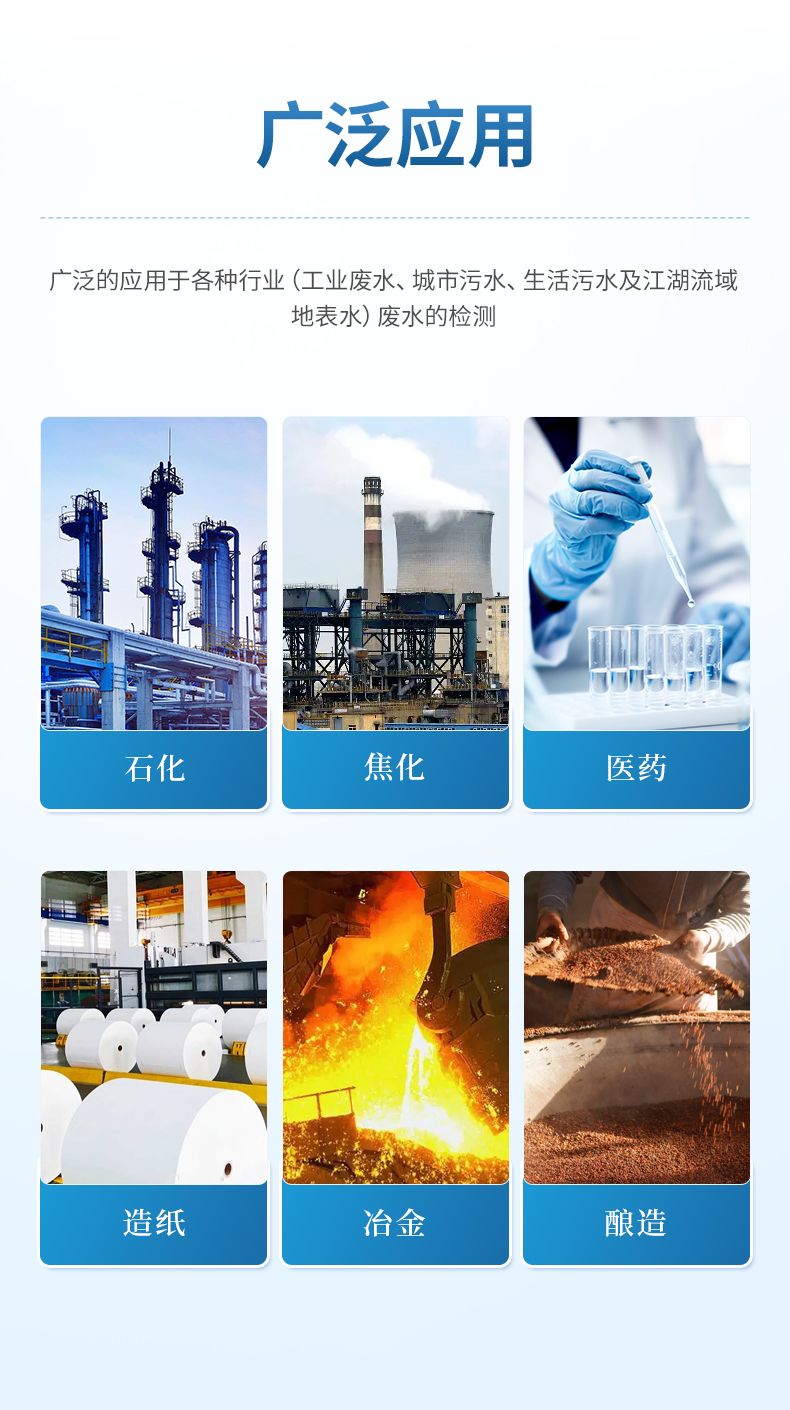 能夠廣泛的應用于各種行業(工業廢水、城市污水、生活污水及江湖流域地表水)廢水的檢測,可適合不同用戶的多種需求,可在化工、石油、焦化、造紙、冶金、釀造、醫藥等工業廢水及各種生活污水監測應用。