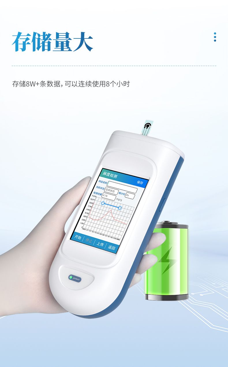 麻度檢測儀采用一次性三電極片在電位作用下,椒素在工作電極表面富集,然后在工作電壓下得失電子,發生氧化還原反應,這時電流信號在顯示器上呈現相應的氧化還原峰,根據峰電流的大小對花椒酰胺的含量進行定量分析。