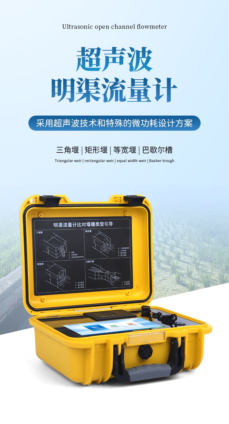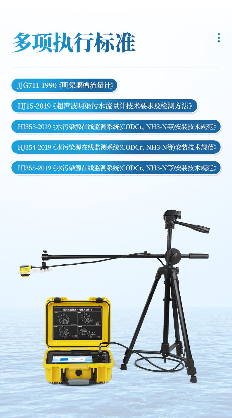 便攜式明渠流量計是專為水文監測、江河流量監測、農業灌溉及市政給排水等行業設計的一種高精度測量儀表,它采用超聲波技術和特殊的微功耗設計方案,結合全數字信號處理技術,確保了測量的穩定性與可靠性。該設備具有廣泛的測量范圍和較高的測量精度,支持實時數據顯示、數據記錄、導出及打印等功能,操作簡便且準確度高,非常適合于需要頻繁移動進行測量的場合。同時,它依據JJG711-1990檢定規程,并參照HJ353-2019、HJ354-2019、HJ355-2019以及HJ15-2019中對流量監測單元的相關要求進行比對驗收,確保了其在水利工程、環境監測、農業灌溉等領域的適用性和準確性。