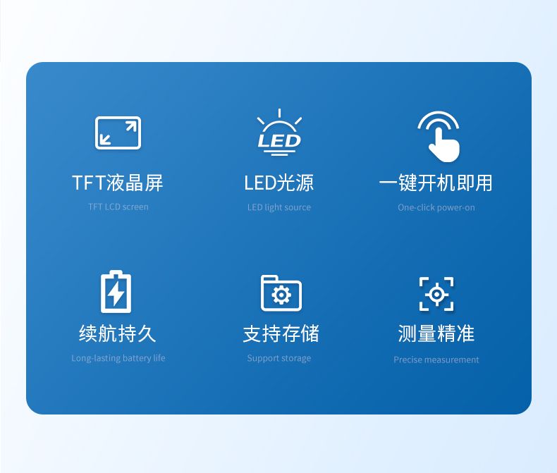 儀器支持存儲、查閱共200套測量數(shù)據(jù); 具有電池電量提示功能,設有5分鐘無按  鍵操作下的自動關機功能,續(xù)航持久;