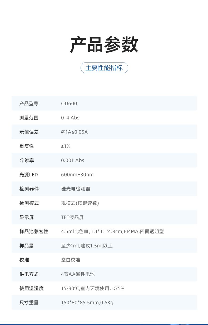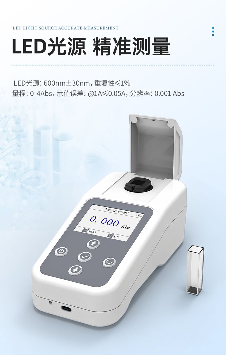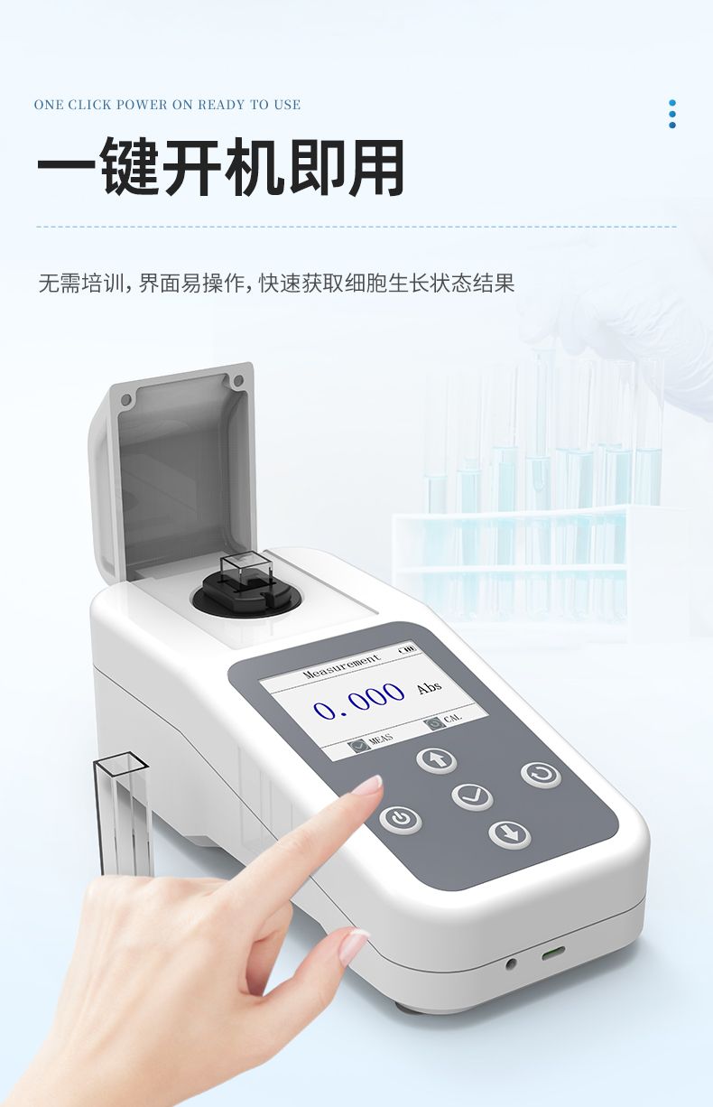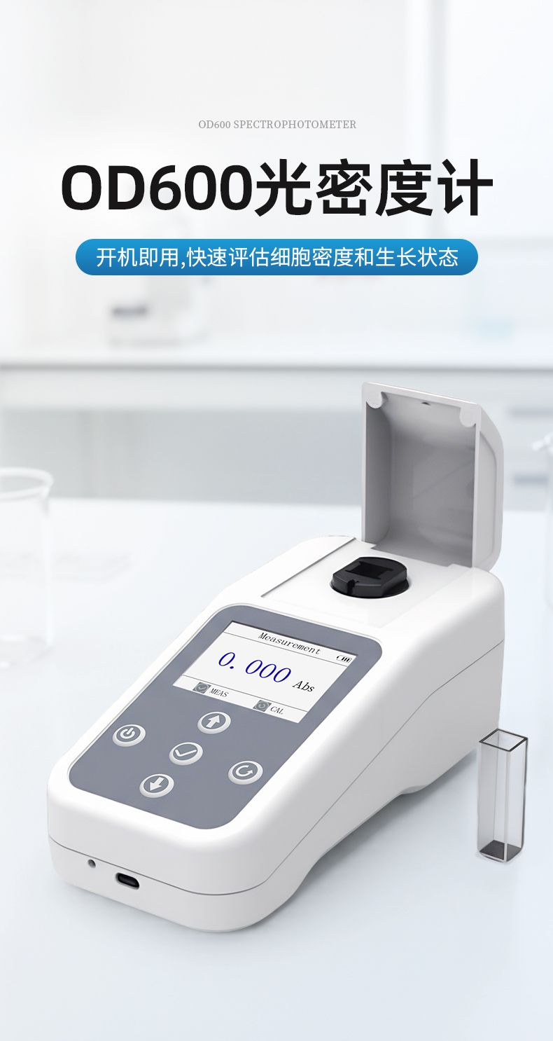 OD600是一款測量0-4Abs范圍內細菌等培養(yǎng)液在600nm波長下的吸光度 (Optical Density,OD), 從而間接評估細胞密度和生長狀態(tài)的儀器。基于朗伯-比爾定律 (Lambert-Beer  Law):    當波長為600nm的光穿過樣品時,細胞會散射和吸收光線,吸光度 (OD 值)與細胞密度成正比。可廣泛應用于微生物學、分子生物學、發(fā)酵工程和生物制藥等領域。