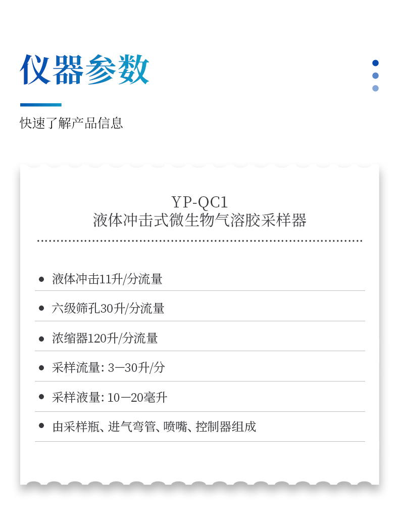 液體沖擊式微生物氣溶膠采樣器有三個切線式彎度的噴嘴頭,具決定性的或音速(sonic flow)的小孔,每孔允許4.2公升/分鐘的空氣通過共同組成的流量,達到約12.5公升/分鐘的流速。容許有效捕集總生物氣膠或活生物氣膠有效時間達8小時以上 。