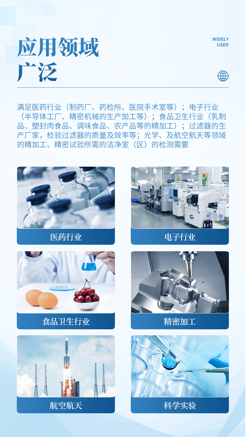 滿足醫(yī)藥行業(yè)(制藥廠、藥檢所、醫(yī)院手術室等);電子行業(yè)(半導體工廠、精密機械的生產加工等);食品衛(wèi)生行業(yè)(乳制品、塑封肉食品、調味食品、農產品等的精加工);過濾器的生產廠家,檢驗過濾器的質量及效率等;光學、及航空航天等領域的精加工、精密試驗所需的潔凈室(區(qū))的檢測需要。