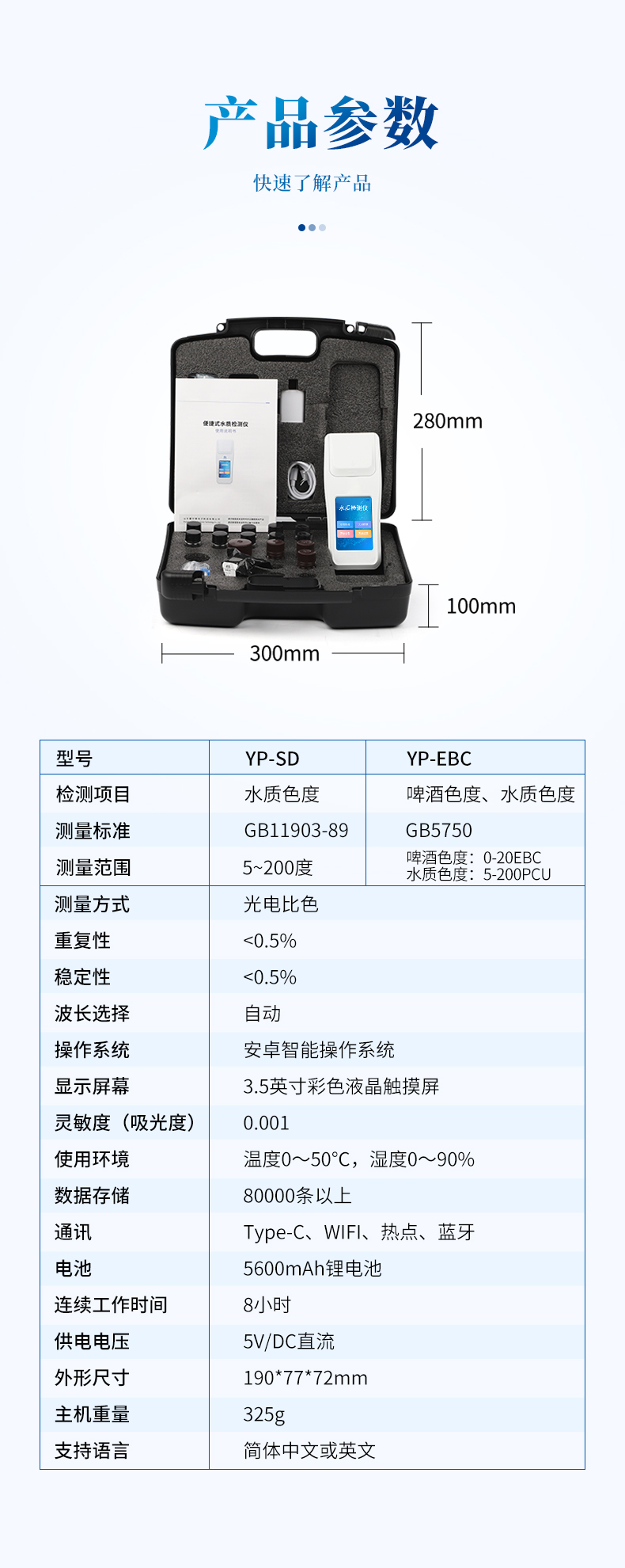 【產品簡介】啤酒色度:0-20EBC 水質色度:5-200PCU 測量標準:GB5750