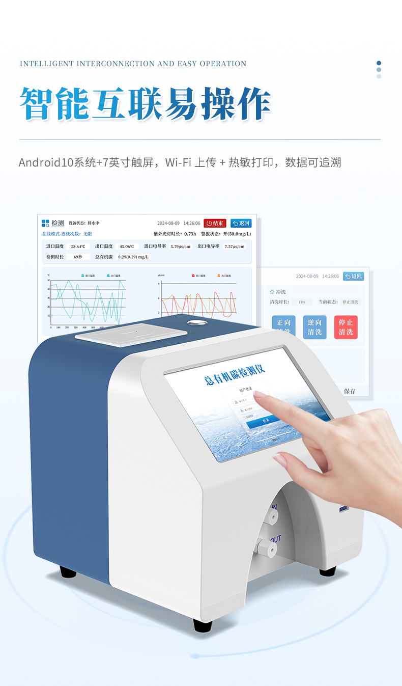 儀器利用特定波長的紫外光直接照射水樣,產生具有極強氧化性的自由基(如·OH羥基自由基)。這些高能自由基能迅速且徹底地將水中有機物分子氧化降解為二氧化碳(CO?)。生成的CO?溶于水后形成碳酸,引起水樣電導率的顯著變化。高精度電導率傳感器通過精確捕捉氧化前后電導率的差值,并自動扣除無機碳等的本底干擾,最終經儀器內部的算法模型換算,即可專一、準確地得到水樣中的總有機碳(TOC)含量。這種光化學氧化方式無需高溫高壓,反應快速完全,結合電導率檢測的高靈敏度,使其特別適用于高純水的精準監測。