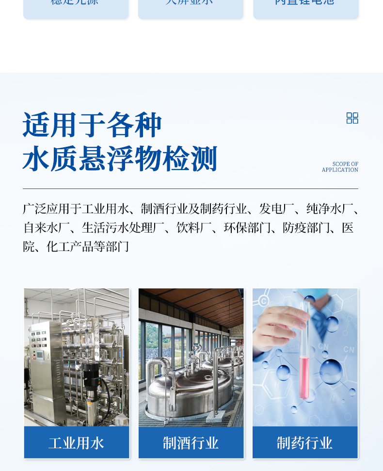 可以廣泛應用于發電廠、純凈水廠、自來水廠、生活污水處理廠、飲料廠、環保部門、工業用水、制酒行業及制藥行業、防疫部門、醫院、化工產品等部門的濁度測量.