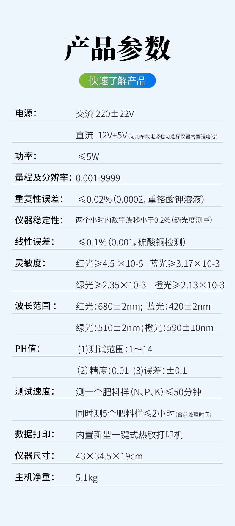 測試一個復合肥料樣(N、P、K)≤50分鐘; 每增加一個肥料樣品時間增加20分鐘。