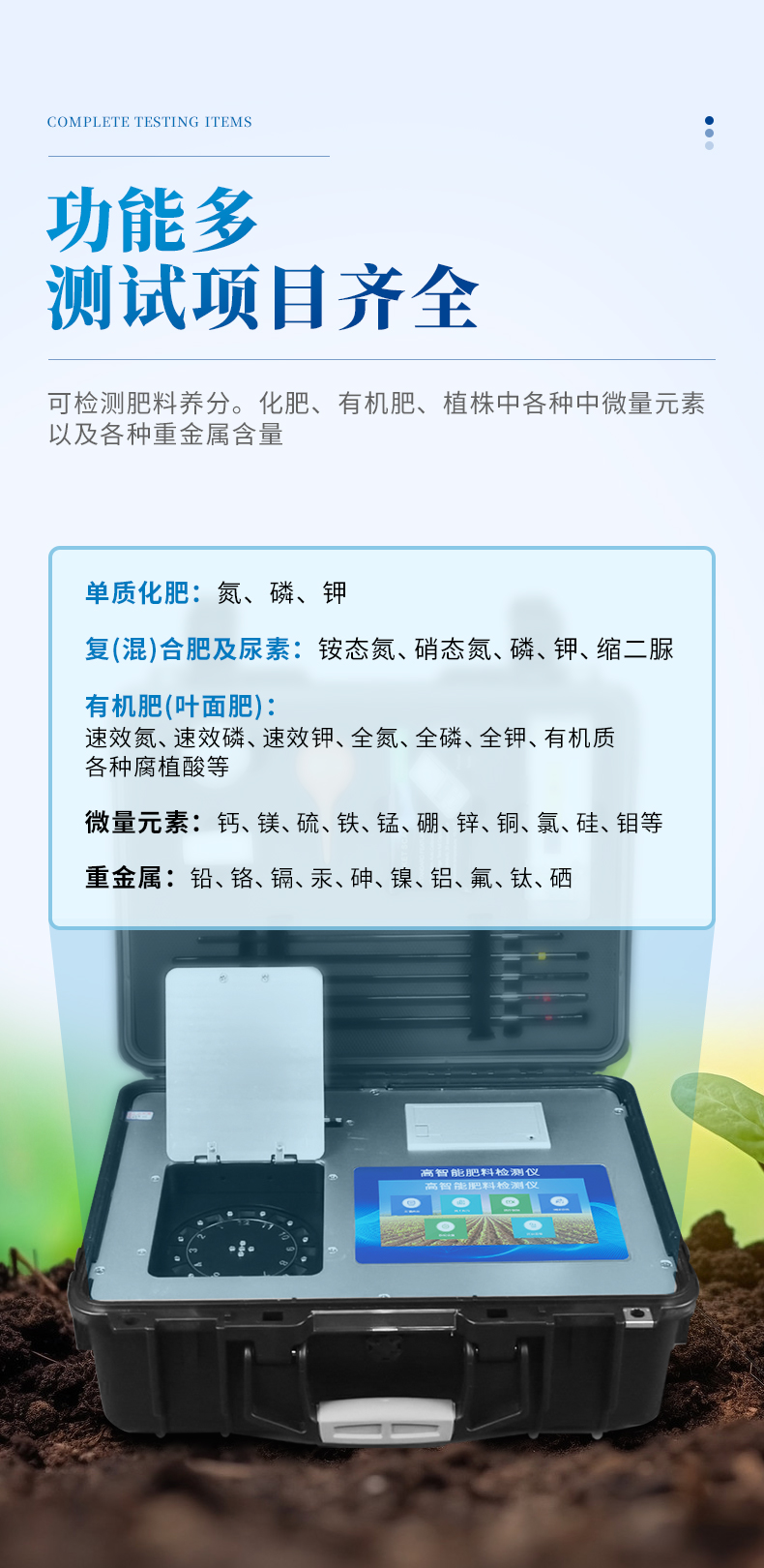 肥料養分專用檢測儀功能全:測試項目國內外最全(各類藥劑均可選購)。