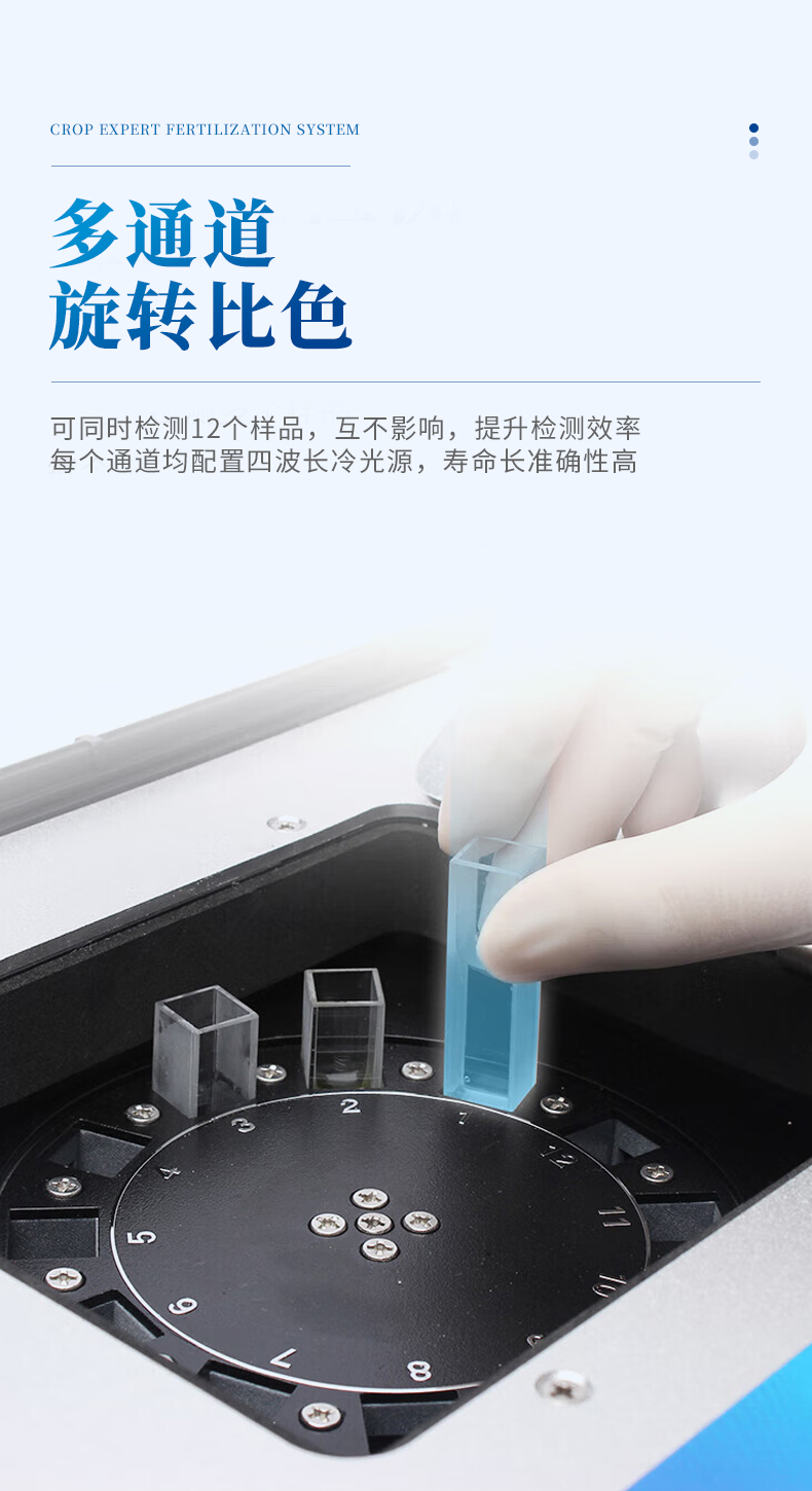 4、采用精密旋轉比色池設計,光源一致性更加精確保證檢測精度。一次性可快速檢測12個樣品,極大提升檢測效率,降低檢測成本。