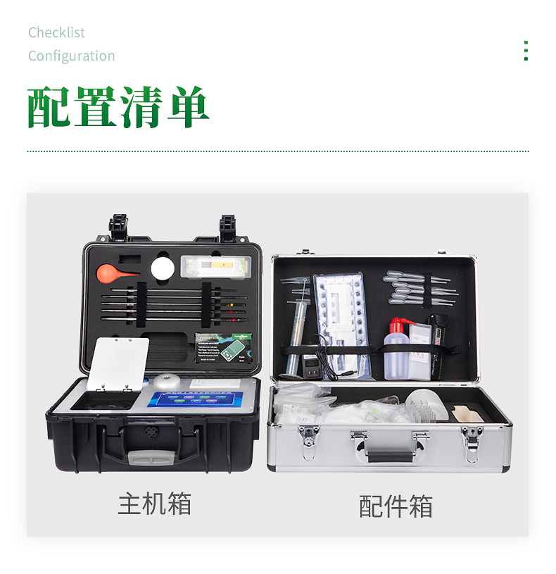 配套齊全:該儀器集藥、器、儀為一體,攜帶方便,相當于一個小型移動實驗室,無需用戶自配附件,亦可靈活野外流動測試。適于農業服務部門或農資經銷商、高教院校、科研院所、合作社、肥料廠商、大種植戶測土施肥和鑒別肥料真假及環保檢測應用。