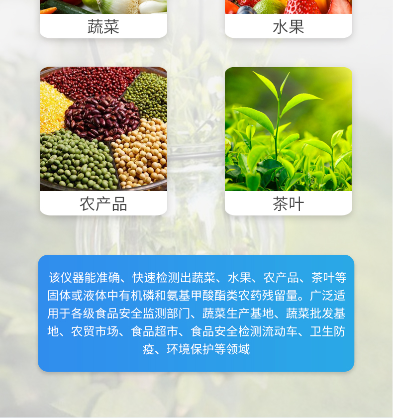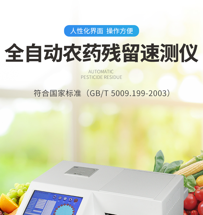 該儀器依據國家標準(GB/T 5009.199-2003)和農業標準方法(NY/T 448-2001)中的酶抑制率法設計制造,能準確、快速檢測出蔬菜、水果、農產品、茶葉等固體或液體中有機磷和氨基甲酸酯類農藥殘留量。廣泛適用于各級食品安全監測部門、蔬菜生產基地、蔬菜批發基地、農貿市場、食品超市、食品安全檢測流動車、衛生防疫、環境保護等領域。