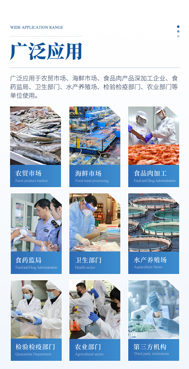 該設備可快速檢測魚、蝦等水產類中的氯霉素、孔雀石綠、四環素類、硝基呋喃類、磺胺類、喹諾酮沙星類;添加劑類甲醛、雙氧水、工業堿、過氧化苯甲酰、草酸等;重金屬鉛、鉻、鎘、汞、砷等快速檢測,該快速檢測系統設備利用抑制免疫層析的原理和光電比色法,為集成化食品安全快速檢測分析設備,廣泛應用于養殖場、屠宰場、食品肉產品深加工企業、檢驗檢疫部門、食藥監局、衛生部門、高教院校、科研院所、農業部門等單位使用。