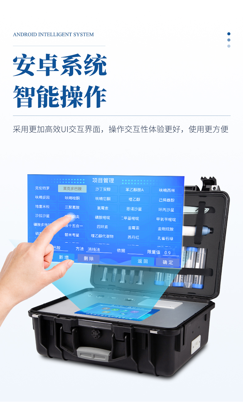 6、一體化便攜式快檢設備,滿足現場及流動檢測使用需求,能夠在同一軟件下實現所有檢測項目的檢測,并可通過同一窗口直觀顯示檢測結果。