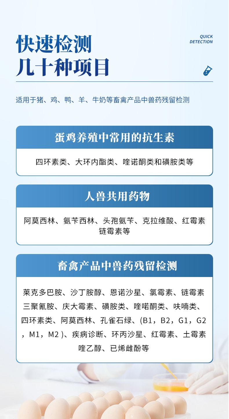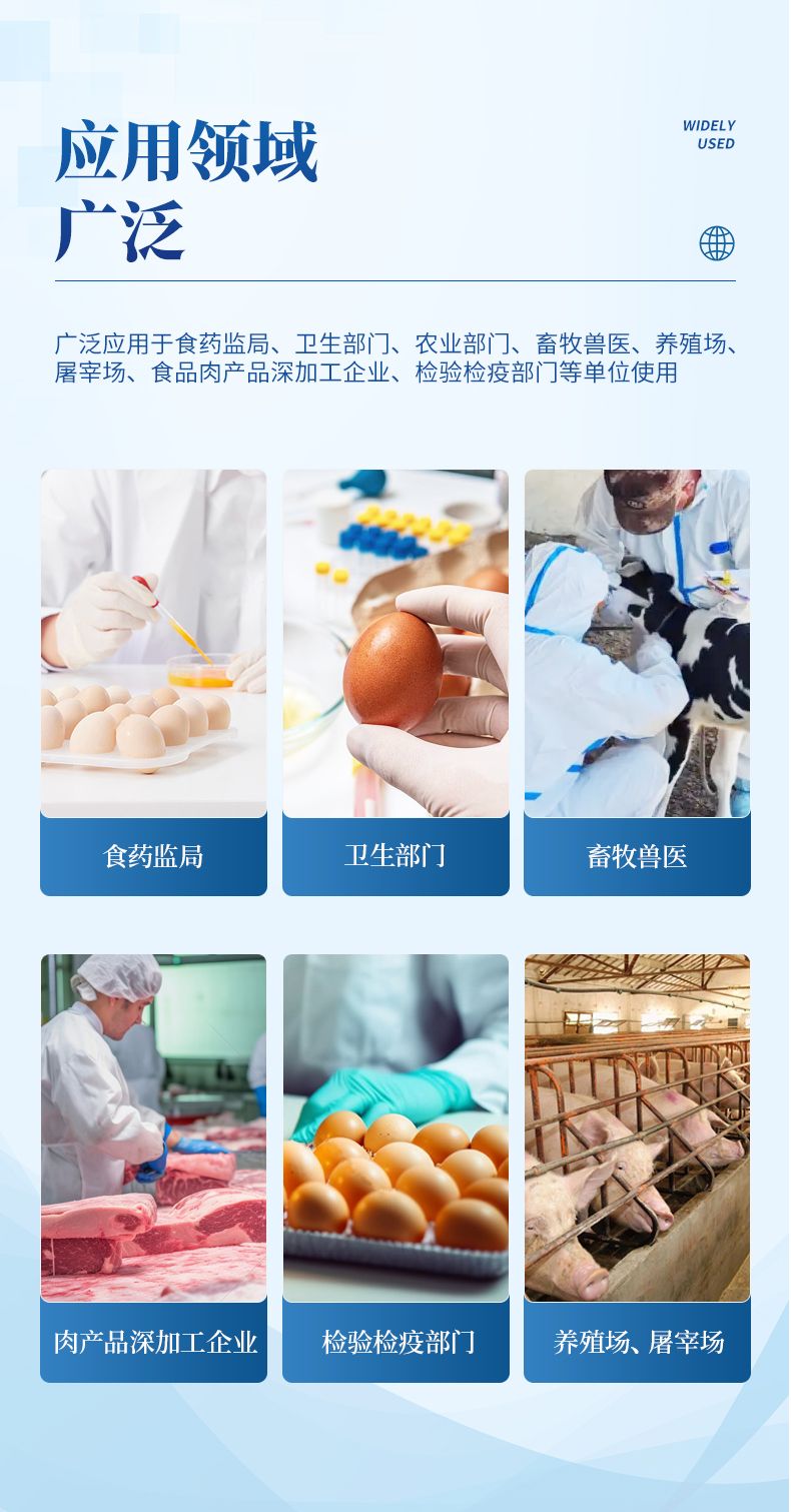 雞蛋抗生素檢測儀可適用于豬、雞、鴨、羊、牛奶等畜禽產品中獸藥殘留檢測,如、萊克多巴胺、沙丁胺醇、恩諾沙星、氯霉素、鏈霉素、三聚氰胺、慶大霉素、磺胺類、喹喏酮類、呋喃類、四環(huán)素類、阿莫西林、孔雀石綠、(B1,B2,G1,G2,M1,M2 )、疾病診斷、環(huán)丙沙星、紅霉素、土霉素、喹乙醇、已烯雌酚等。并廣泛應用于廣泛應用于食藥監(jiān)局、衛(wèi)生部門、農業(yè)部門、畜牧獸醫(yī)、養(yǎng)殖場、屠宰場、食品肉產品深加工企業(yè)、檢驗檢疫部門等單位使用。