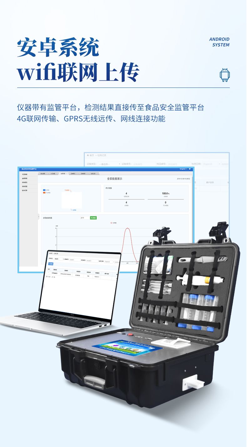 4、儀器帶有監(jiān)管平臺,數(shù)據(jù)可局域網和互聯(lián)網數(shù)據(jù)上傳,檢測結果直接傳至食品安全監(jiān)管平臺。進行區(qū)域食品安全監(jiān)管及大數(shù)據(jù)分析處理與數(shù)據(jù)統(tǒng)計,檢測區(qū)域食品安全長短期動態(tài),達到食品安全問題預估、預警