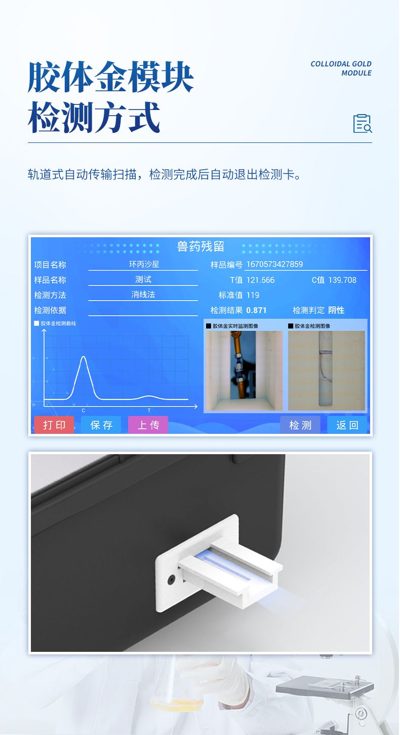 7、膠體金模塊檢測方式:軌道式自動傳輸掃描,檢測完成后自動退出檢測卡。