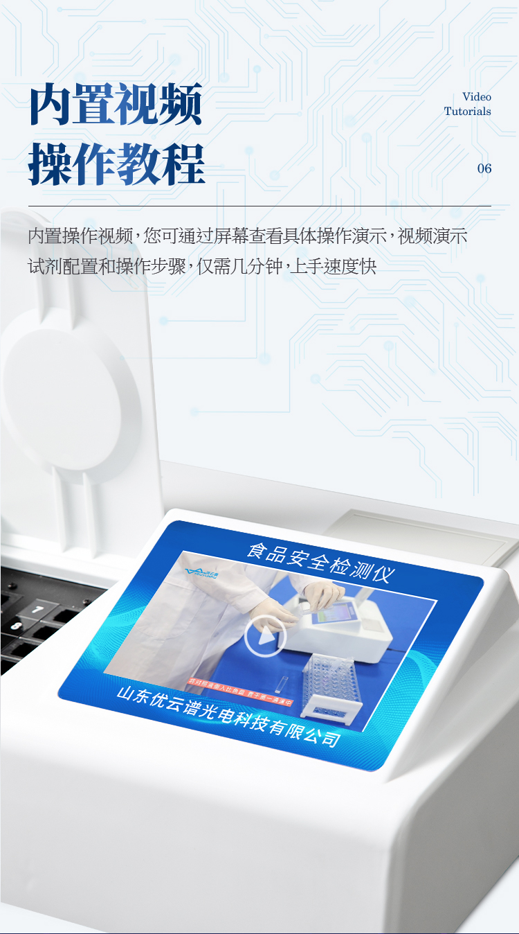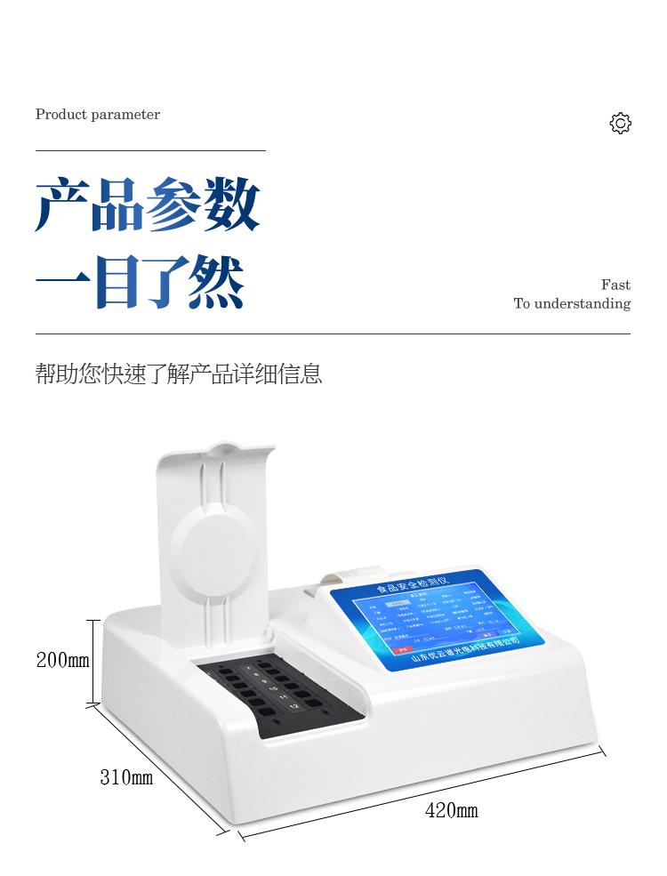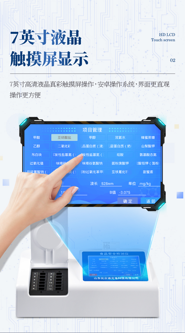 1、檢測項目:可快速檢測各類食品中的甲醛、二氧化硫、亞硝酸鹽、吊白塊、農藥殘留的含量,儀器預留其他項目檢測程序和端口,根據日后需求可方便的自主增加檢測項目。
