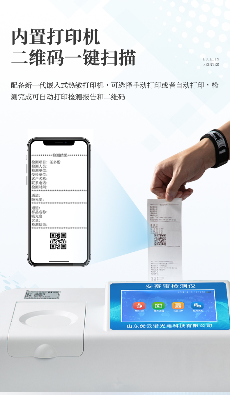 5、配備新一代嵌入式熱敏打印機,可選擇手動打印或者自動打印,檢測完成可自動打印檢測報告和二維碼。