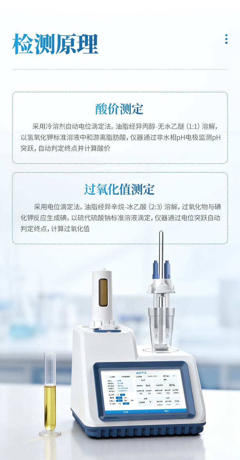 過氧化值測定:采用電位滴定法。油脂經異辛烷-冰乙酸(2:3)溶解,過氧化物與碘化鉀反應生成碘,以硫代硫酸鈉標準溶液滴定,儀器通過電位突躍自動判定終點,計算過氧化值。