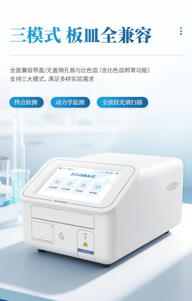 8. 支持終點檢測、動力學監(jiān)測、全波段光譜掃描三大模式,兼容帶蓋/無蓋微孔板及比色皿(含比色皿孵育功能);