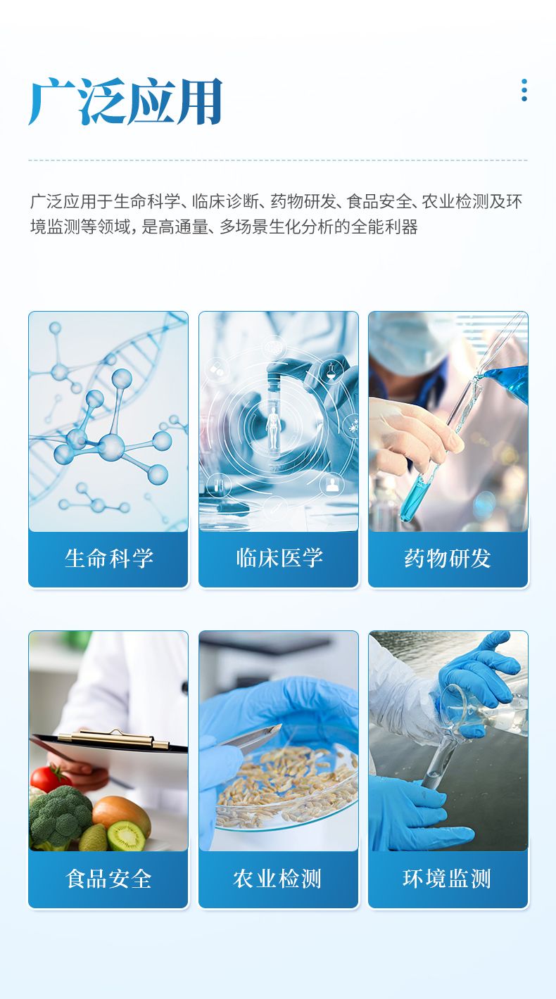 全光譜酶標儀主要應用于生命科學與醫(yī)學研究領域,是進行蛋白質(zhì)定量、核酸濃度測量、酶動力學研究、細胞活性與毒性檢測以及ELISA實驗的基石,廣泛應用于高校、科研院所和醫(yī)院實驗室。在醫(yī)藥與生物技術行業(yè),它是藥物研發(fā)過程中進行高通量篩選、藥效毒理評估及生物制品質(zhì)量控制的必備工具;在農(nóng)業(yè)與食品安全領域,用于檢測作物病害、食品中的過敏原、毒素及農(nóng)藥殘留;在環(huán)境監(jiān)測方面,它還可用于分析水體和土壤中的污染物,成為保障公共安全的重要工具。