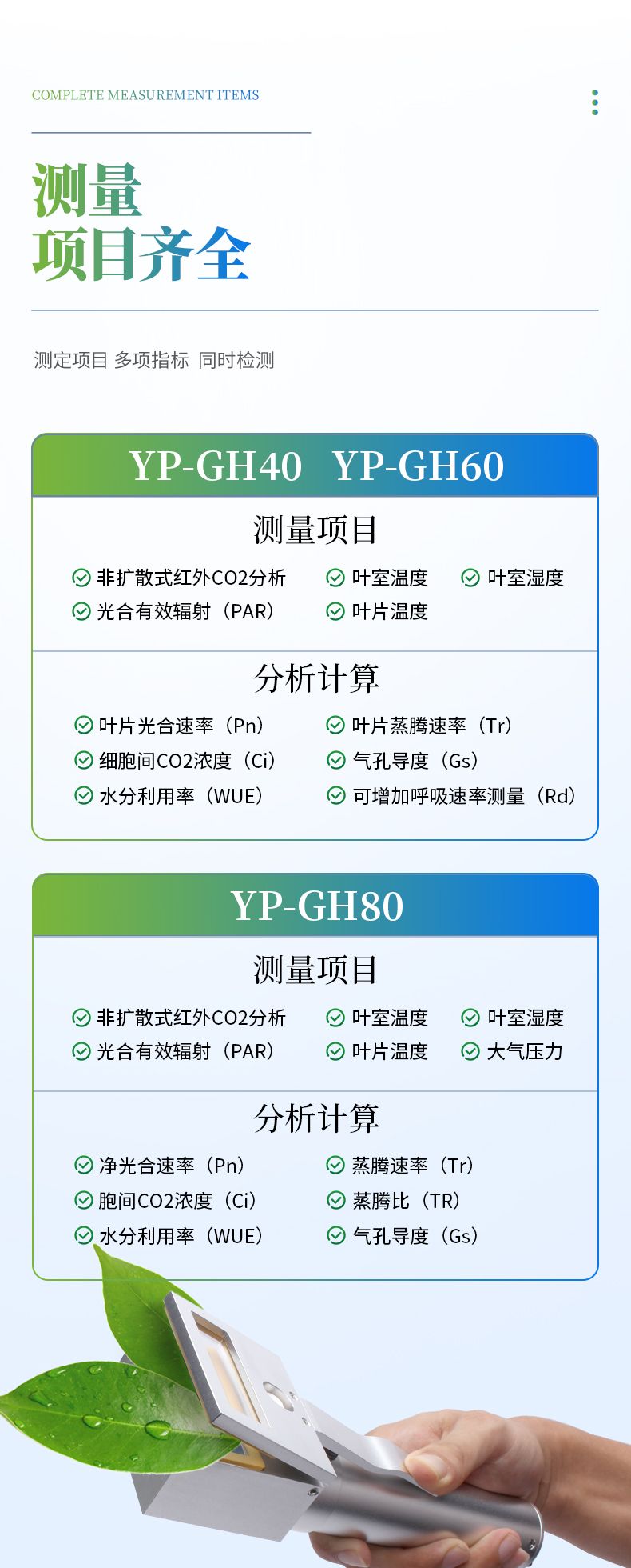 YP-GH40光合作用測定儀采用閉路測量方法可以測定氣體CO2濃度、空氣溫濕度,植物葉片溫度,光強,氣體流量等要素,并計算出植物的光合速率、蒸騰速率、細胞間CO2濃度、氣孔導度、水分利用率等光合作用指標,在生物、農學、園藝、林業、昆蟲、微生物、動物等許多專業的實驗課程中有廣泛的利用前景.